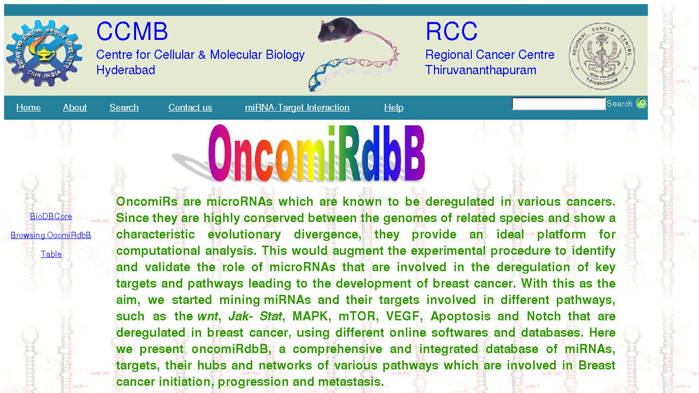 OncomiRdbB is an integrated database consisting of the miRNAs of human and mouse genomes, their sequences, chromosome and gene locations, respective targets and their description, pathways it regulates in breast cancer.The miRNAs were mined from miRBase, Phenomir, Mir2Disease etc and their respective sequences were obtained from miRbase. Their target genes were computationally derived from different oncogenic pathways such as wnt, Jak- Stat, MAPK, mTOR, VEGF, Apoptosis and Notch pathways and their genomic sequences from ENSEMBLE- BioMart. Additionally, we have also listed the experimentally validated novel microRNAs for human breast cancer.