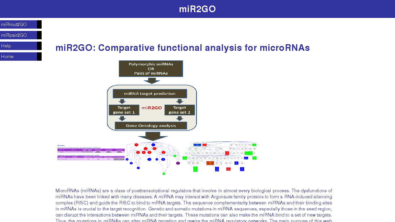 miR2GO is a web-based platform for comparative analyses of human miRNA functions. It includes two programs: miRmut2GO and miRpair2GO. miRmut2GO implements a knowledge-based method to assess the functional effects of genetic and somatic mutations in microRNA seed regions. The functional effects of a mutation are analysed by semantic comparison of enriched gene ontology (GO) annotations of the target gene sets for the wild-type and mutated alleles. miRpair2GO compares the functions of two different miRNAs based on the enriched functional annotations of their target gene sets.