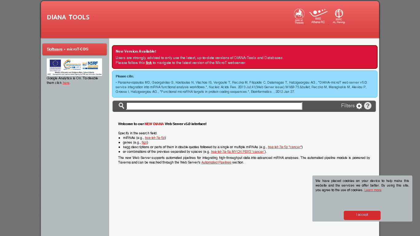 DIANA-microT-CDS is the 5th version of the microT algorithm. It is specifically trained on a positive and a negative set of miRNA Recognition Elements (MREs) located in both the 3'-UTR and CDS regions. DIANA-microT-CDS provides a significant increase in sensitivity compared to the previous version (65% vs 52%), when compared against experimental proteomics data.