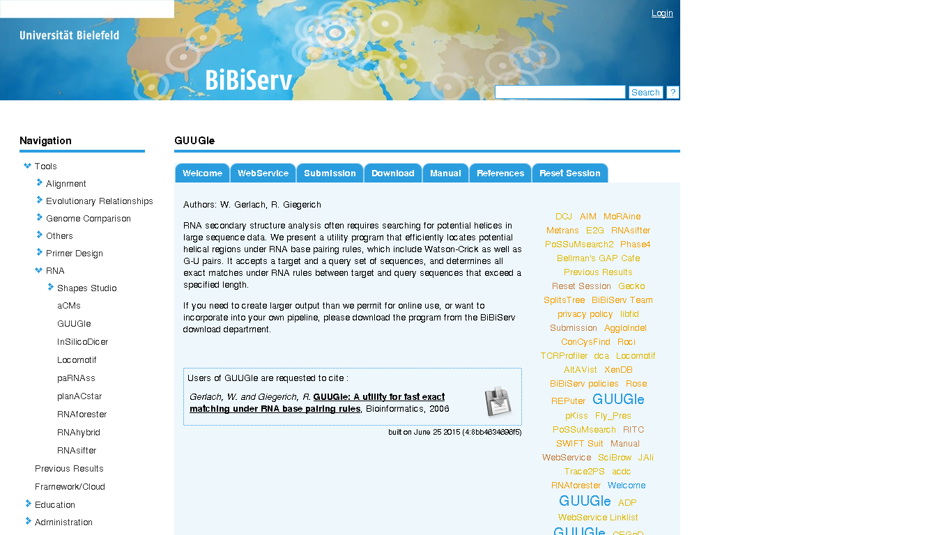 GUUGle efficiently locates potential helical regions under RNA base pairing rules, which include Watson-Crick as well as G-U pairs. It accepts a target and a query set of sequences, and determines all exact matches under RNA rules between target and query sequences that exceed a specified length.