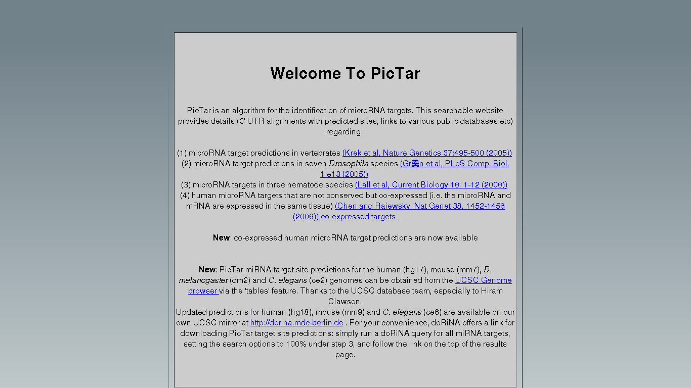 PicTar is a computational method for identifying common targets of microRNAs. Statistical tests using genome-wide alignments of eight vertebrate genomes, PicTar's ability to specifically recover published microRNA targets, and experimental validation of seven predicted targets suggest that PicTar has an excellent success rate in predicting targets for single microRNAs and for combinations of microRNAs.