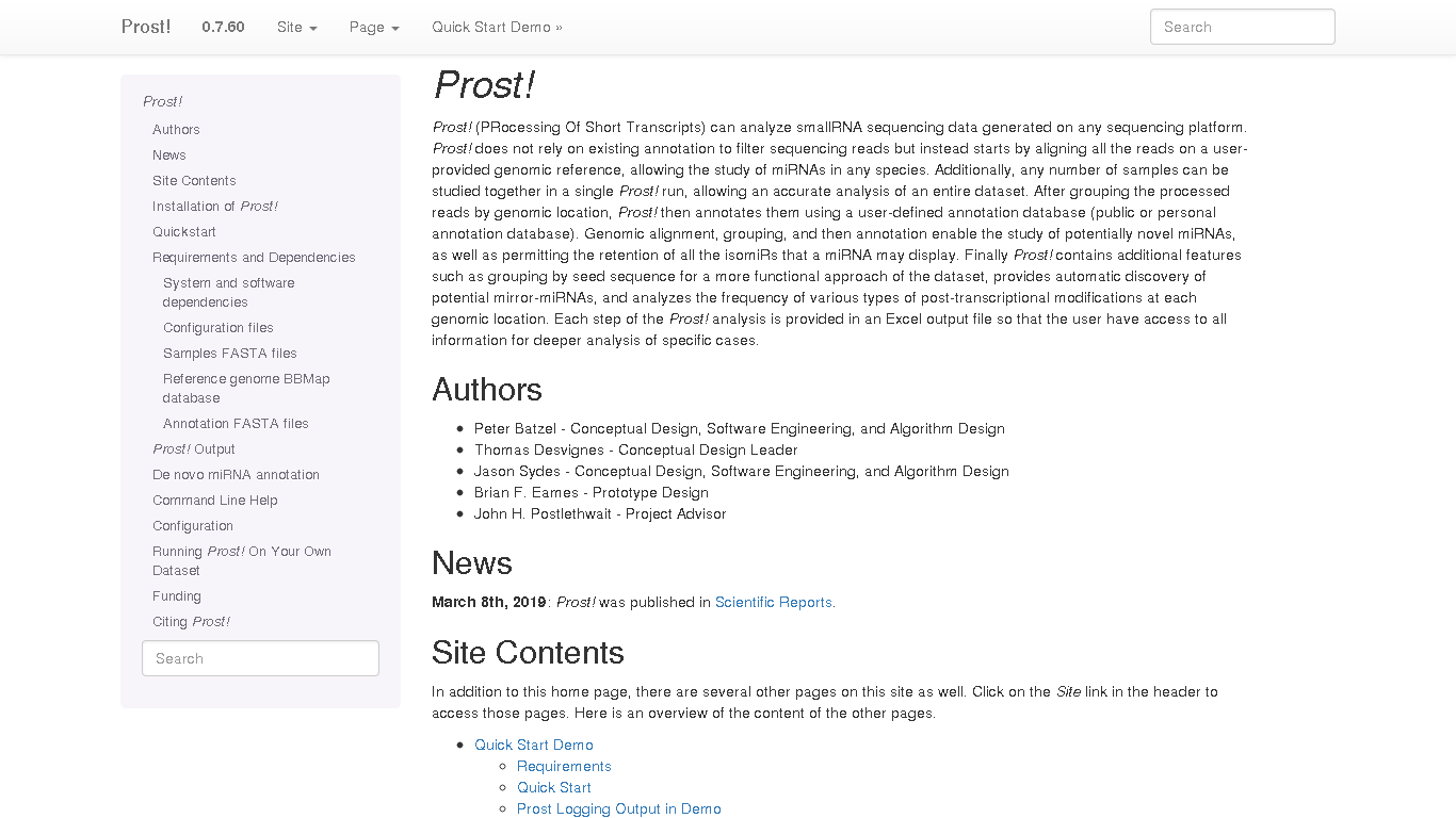 Prost! (PRocessing Of Short Transcripts) analyzes any source of smallRNA sequencing data. Prost! does not rely on existing annotation to filter sequencing reads but instead starts by aligning all the reads on a user-provided genomic reference, allowing the study of miRNAs in any species. Additionally, any number of samples can be studied together in a single Prost! run, allowing a more accurate analysis of an entire dataset. After grouping the processed reads by genomic location, Prost! then annotates the reads using a user-defined annotation database (public or personal annotation database). Genomic alignment, grouping, and then annotation enable the study of potentially novel miRNAs, as well as permitting the retention of all the isomiRs that a miRNA may display. Finally Prost! contains additional features such as grouping by seed sequence for a more functional approach of the dataset, provides automatic discovery of potential mirror-miRNAs, and analyzes the frequency of various types of post-transcriptional modifications at each genomic location. Each step of the Prost! analysis are provided into the excel file output for the user to have all information in hands for deeper analysis of specific cases.