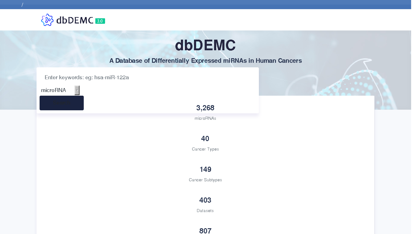 dbDEMC (database of Differentially Expressed MiRNAs in human Cancers) is an integrated database that designed to store and display differentially expressed microRNAs (miRNAs) in human cancers detected by high-throughput methods. In this updated version of dbDEMC, a total of 209 expression profiling data sets across 36 cancer types and 73 subtypes, and a total of 2224 differentially expressed miRNAs were identified.