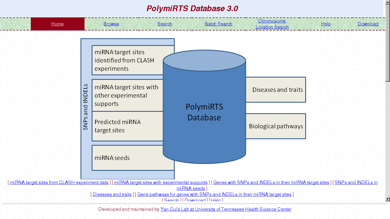An integrated platform for analyzing the functional impact of genetic polymorphisms in miRNA seed regions and miRNA target sites. The browse and search pages of PolymiRTS allow users to explore the relations between the PolymiRTSs and gene expression traits, physiological and behavioral phenotypes, human diseases and biological pathways.