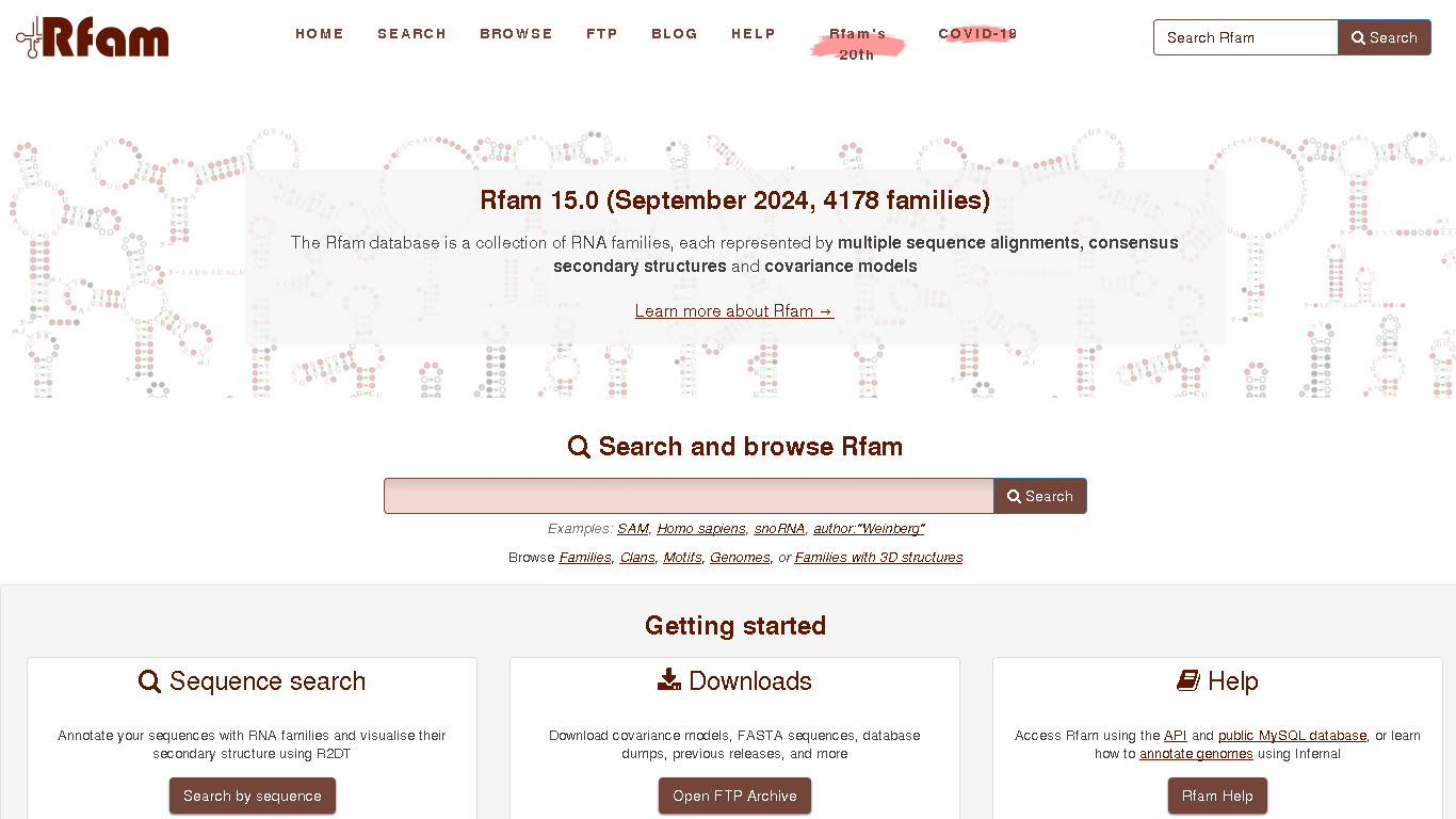 Rfam is the database of non-coding RNA (ncRNA) families (1), each represented by a multiple sequence alignment (known as the seed), a consensus secondary structure, and a covariance model to annotate non-coding RNAs in nucleotide datasets using the Infernal software.
