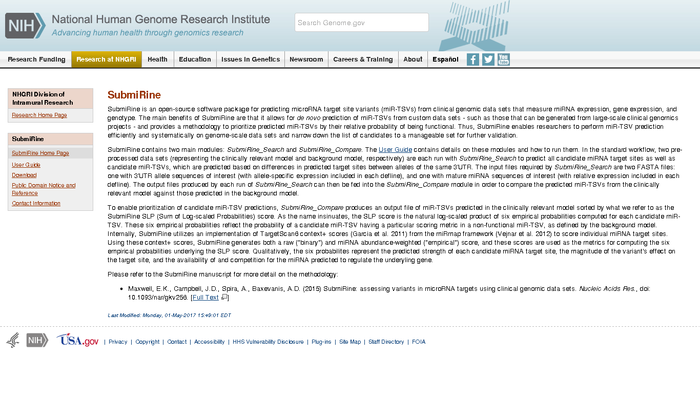 An open-source software package for predicting microRNA target site variants (miR-TSVs) from clinical genomic data sets that measure miRNA expression, gene expression, and genotype. The main benefits of SubmiRine are that it allows for de novo prediction of miR-TSVs from custom data sets - such as those that can be generated from large-scale clinical genomics projects - and provides a methodology to prioritize predicted miR-TSVs by their relative probability of being functional.
