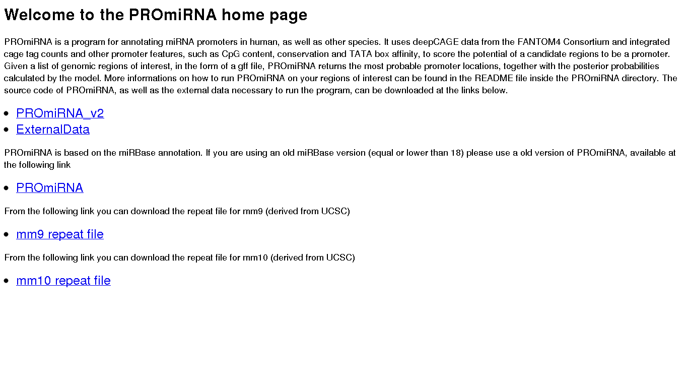 PROmiRNA is a program for annotating miRNA promoters in human, as well as other species. It uses deepCAGE data from the FANTOM4 Consortium and integrated cage tag counts and other promoter features, such as CpG content, conservation and TATA box affinity, to score the potential of a candidate regions to be a promoter. Given a list of genomic regions of interest, in the form of a gff file, PROmiRNA returns the most probable promoter locations, together with the posterior probabilities calculated by the model.