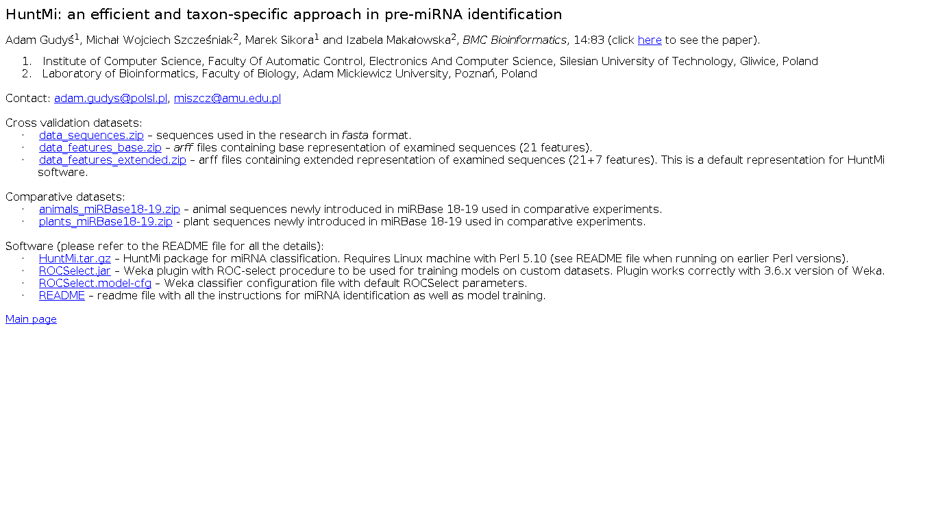 HuntMi is a stand-alone machine learning miRNA classification tool, which deals with the class imbalance problem called ROC-select, which is based on thresholding score function produced by traditional classifiers.